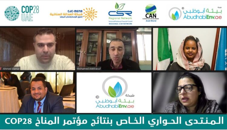 نظمت شبكة بيئة أبوظبي منتدىً حوارياً استعرض فيه الخبراء نتائج مؤتمر الأطراف في اتفاقية الأمم المتحدة الإطارية بشأن تغير المناخ (COP28)، بمشاركة ثلاثة عشر خبيراً عربياً، وبالتعاون مع الشبكة الإقليمية للمسؤولية الاجتماعية، وشبكة العمل المناخي للعالم العربي، وشبكة العدالة المناخية في الشرق الأوسط وشمال افريقيا، وذلك مساء يوم السبت 10 فبراير 2024 عبر المنصة الافتراضية (زووم). حيث أكد المشاركون أنه وعلى الرغم من التقدم الحاصل، لا يزال هناك الكثير من العمل المطلوب لتحقيق الحياد المناخي بحلول 2050، ويتطلب ذلك جهودًا متواصلة ومنسقة من قبل جميع الدول والقطاعات.