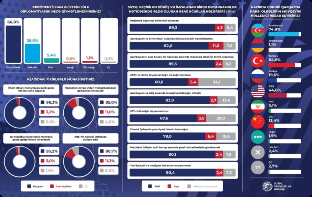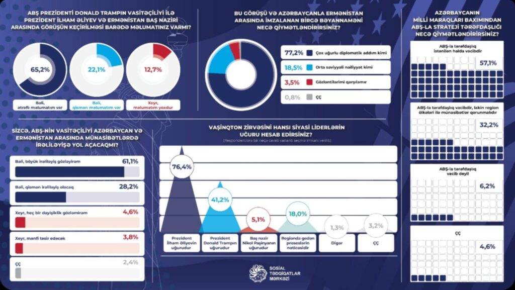 “Prezident İlham Əliyev müharibədə qalib gəldi, indi isə sülhü qazandı” fikri ilə sorğuda iştirak edənlərin 96,3%-i razı olduğunu, 3,2%-i razı olmadığını qeyd edib. 0,5%-i bu barədə rəy bildirməyib. Respondentlərin 85,0%-i Vaşinqton zirvəsini Vətən müharibəsindəki qələbənin nəticəsi kimi dəyərləndirib. Sorğunun nəticələrinə əsasən, ölkə ictimaiyyətinin 95,2%-i bu təşəbbüsü Naxçıvana maneəsiz gediş-gəlişi təmin edilməsi kimi şərh edib. Respondentlərin 80,7%-i ABŞ-nin Cənubi Qafqazda nüfuzunun artdığı mövqeyini bölüşüb. Ölkə ictimaiyyəti Vaşinqton zirvəsini ən çox Prezident İlham Əliyevin uğuru kimi dəyərləndirib. Bu mövqe sorğu iştirakçılarının 76,4%-i tərəfindən səsləndirilib. Respondentlərin 41,2%-i bu zirvəni eyni zamanda Prezident Donald Trampın uğuru kimi dəyərləndirib. Baş nazir Nikol Paşinyan isə yalnız 5,1% tərəfindən qeyd olunub. Eyni zamanda, sorğu iştirakçılarının 18,0%-i keçirilən görüşü regionda gedən proseslərin ümumi məntiqi nəticəsi kimi dəyərləndirib. 1,3% digər cavabları qeyd edib, 3,2% isə cavab verməkdə çətinlik çəkib.